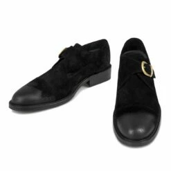 Elevator mono buckle with upper made in black greased suede, golden buckle and stiched leather sole with anti slip rubber.