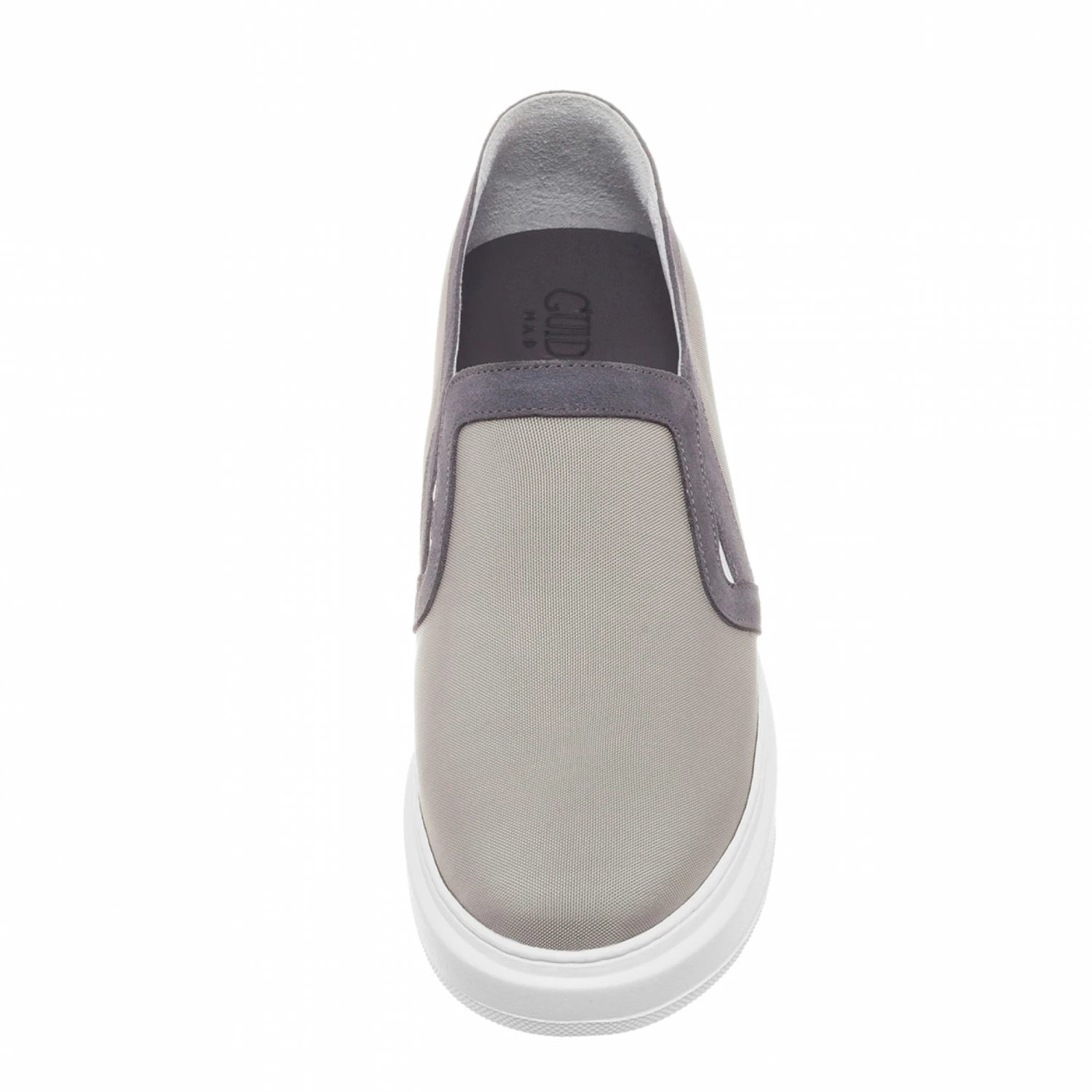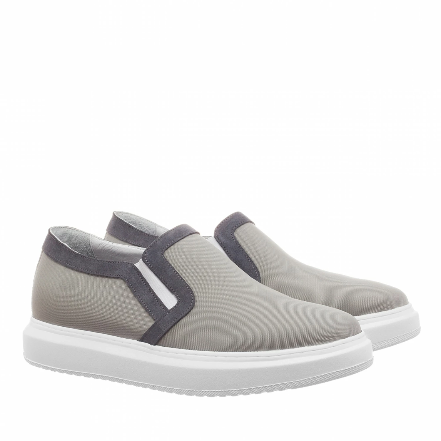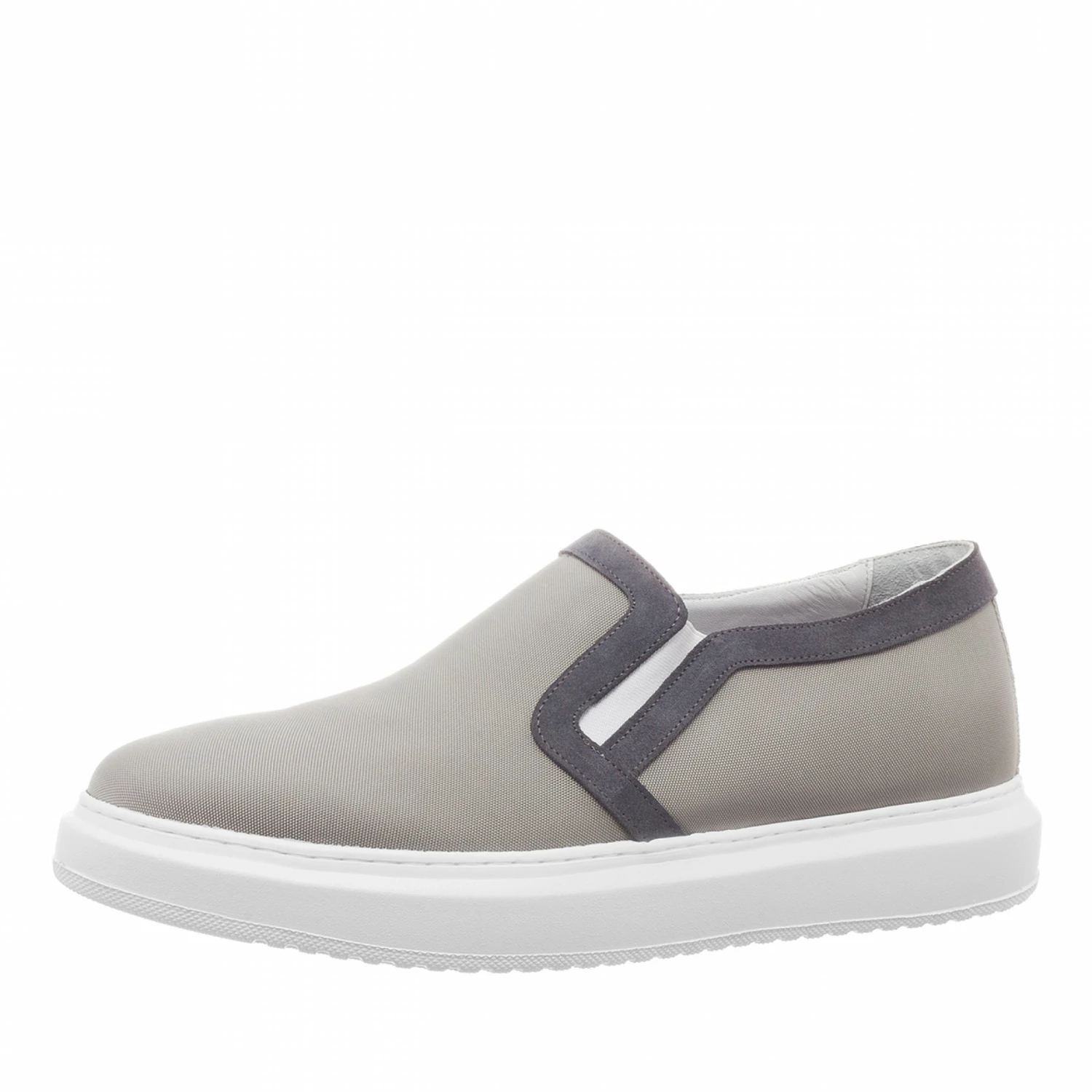Height increasing slip-on with grey upper intechnical fabric and grey suede details. White sole in natural rubber.