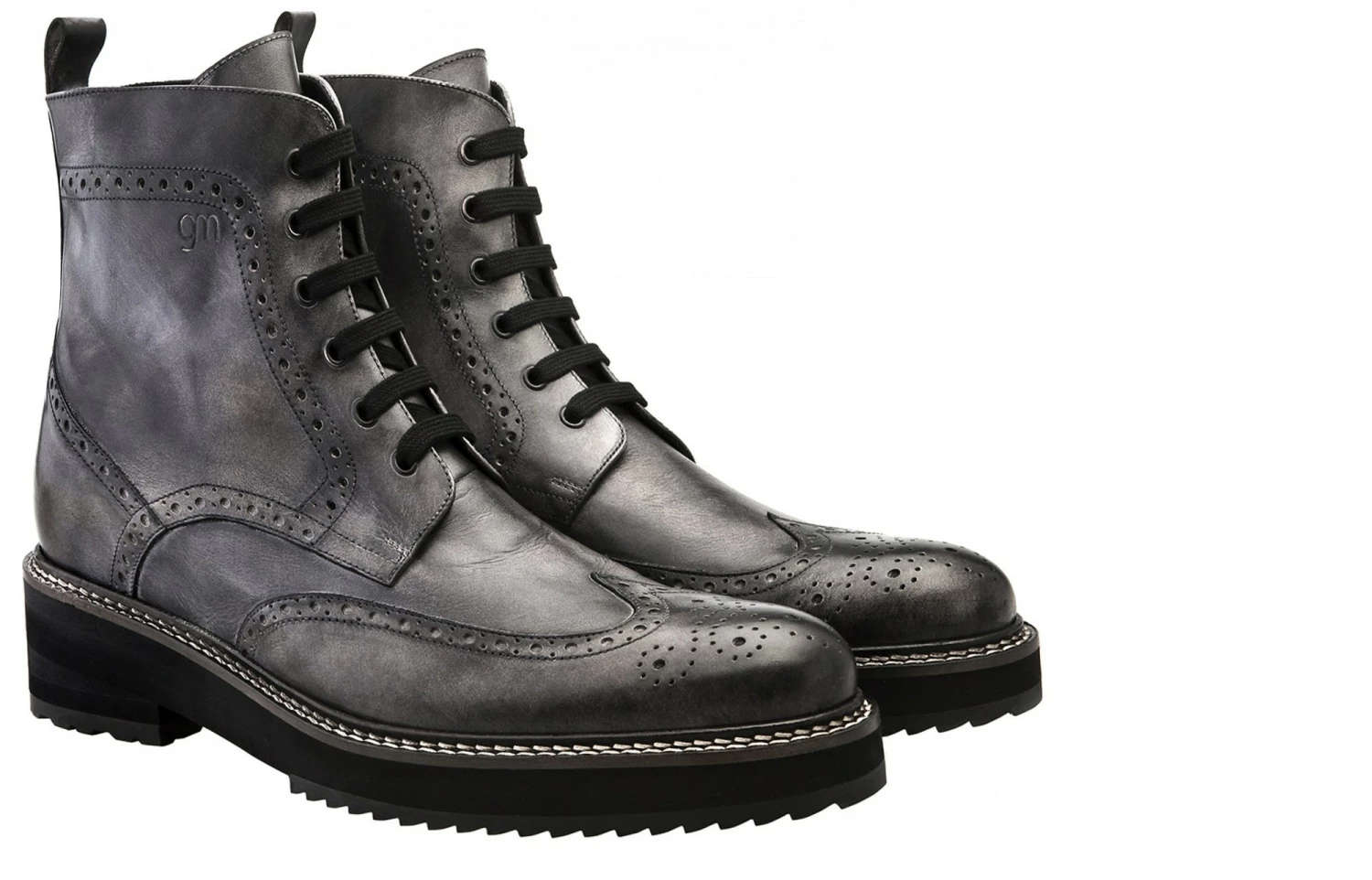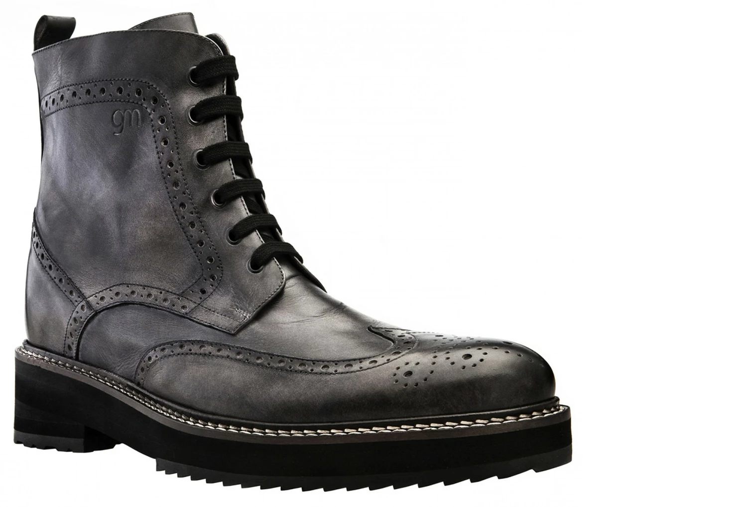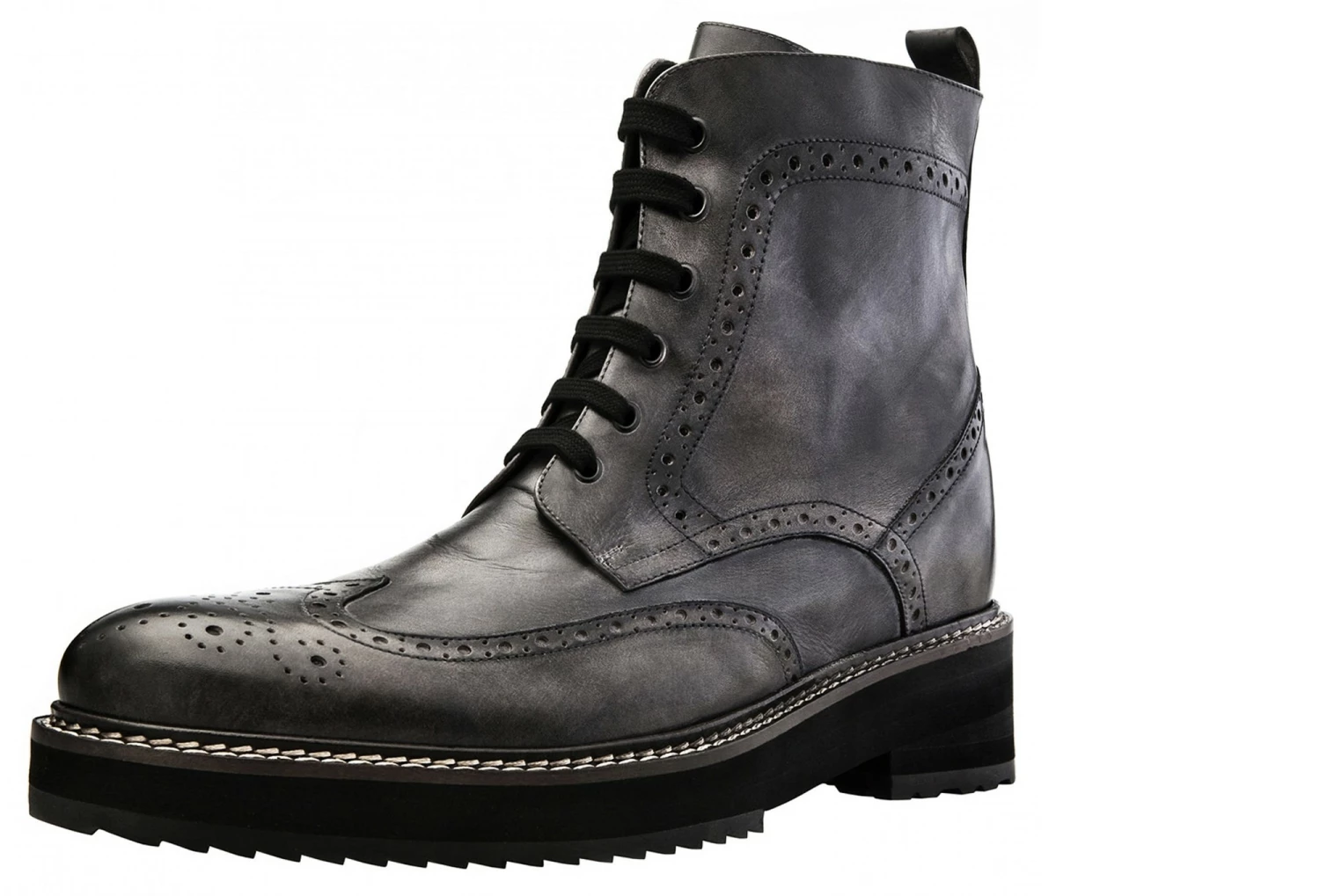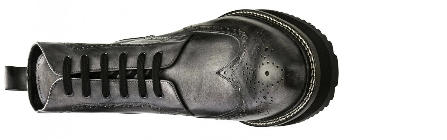 Upper in grey burnished full grain leather. Lining in soft goatskin. Insole and midsole in genuine leather. Cotton waxed shoe laces. Handcrafted, anti-slip rubber sole. Height increase: 4 in(10cm) , 4.3 in(11cm) or 5in(12.5cm). Hand Made in Italy