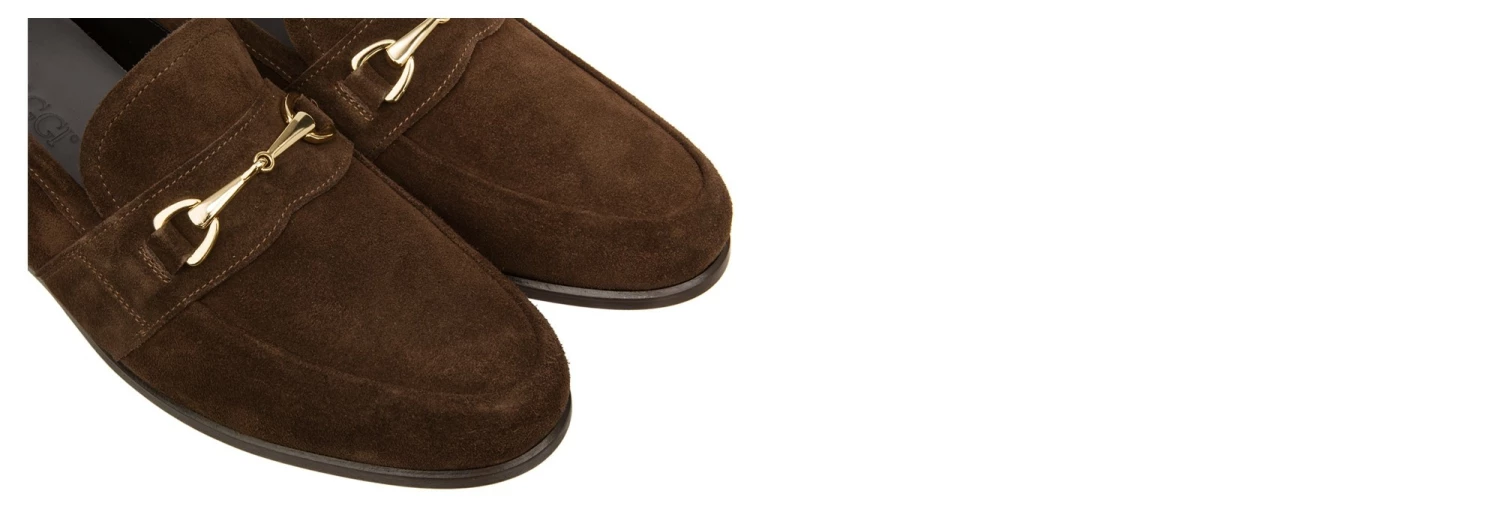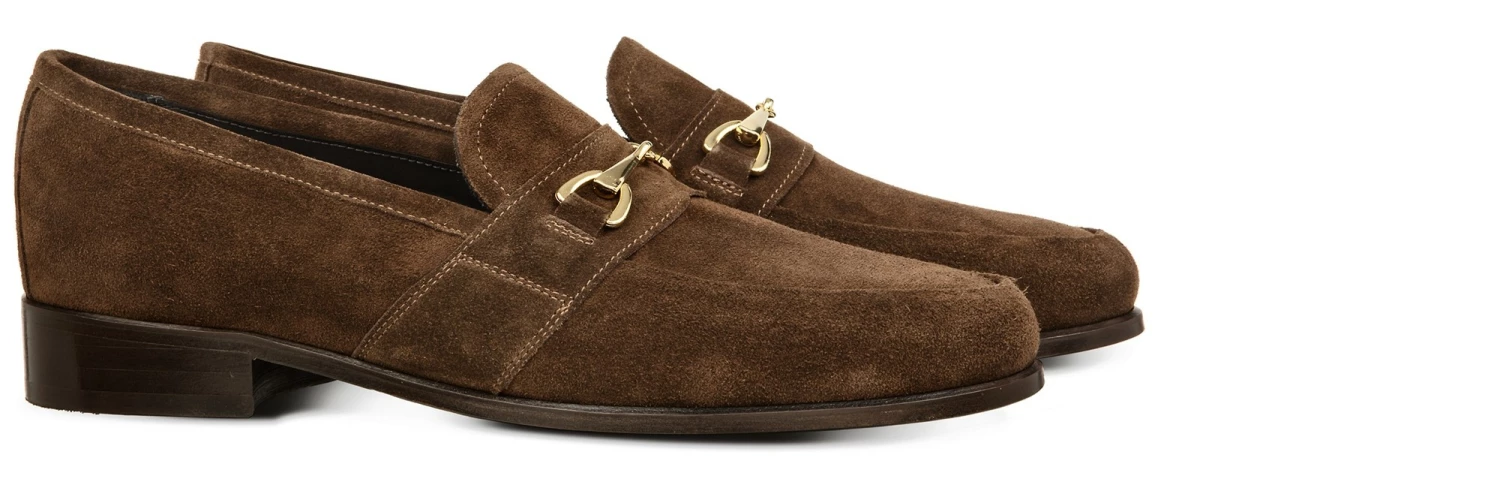 Stylish loafers with 2.6 inches (6.5 cm) elevator system in brown suede and elegant golden clamp.