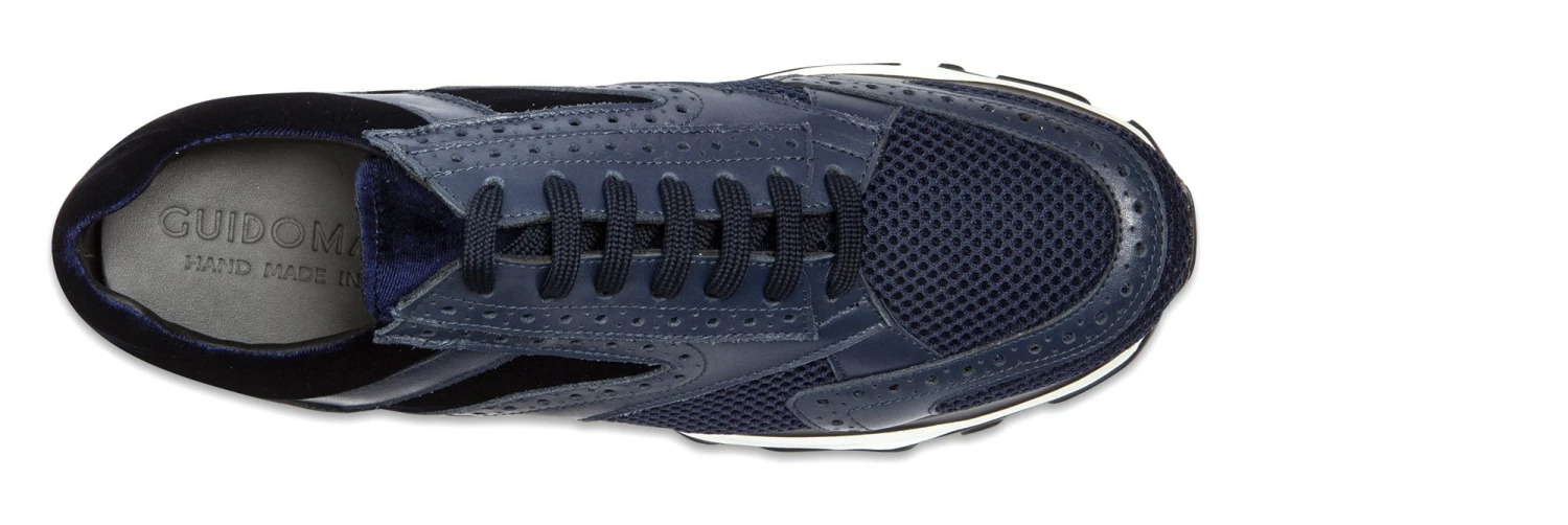 Sporty appeal and strong character. Chunky elevator sneakers with an innovative and contemporary design made of full-grain Tuscan leather, soft velvet and navy blue breathable perforated fabric. The two-tone white/black sole is in extralight rubber.
