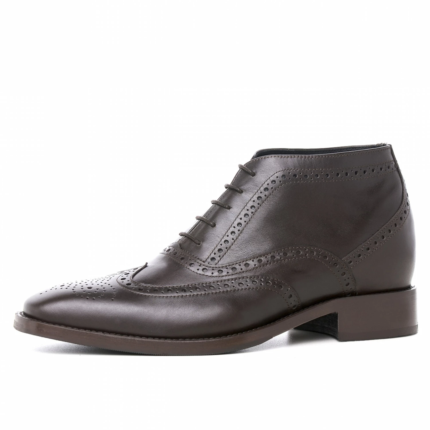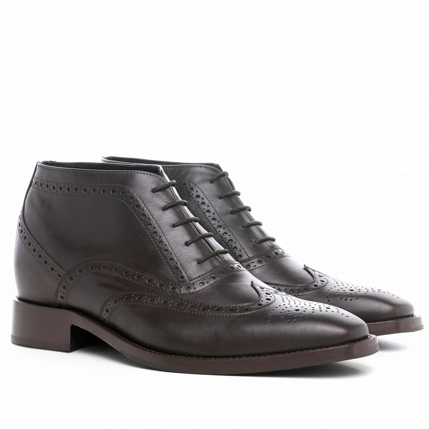 Handcrafted elevator ankle boot to increase height from 2.4 (6 cm) up to 3.1 inches (8 cm) in dark brown full-grain calf leather and stiched leather sole with anti slip rubber. The characteristic English “Brogue” design is hand stamped by the GuidoMaggi artisans.