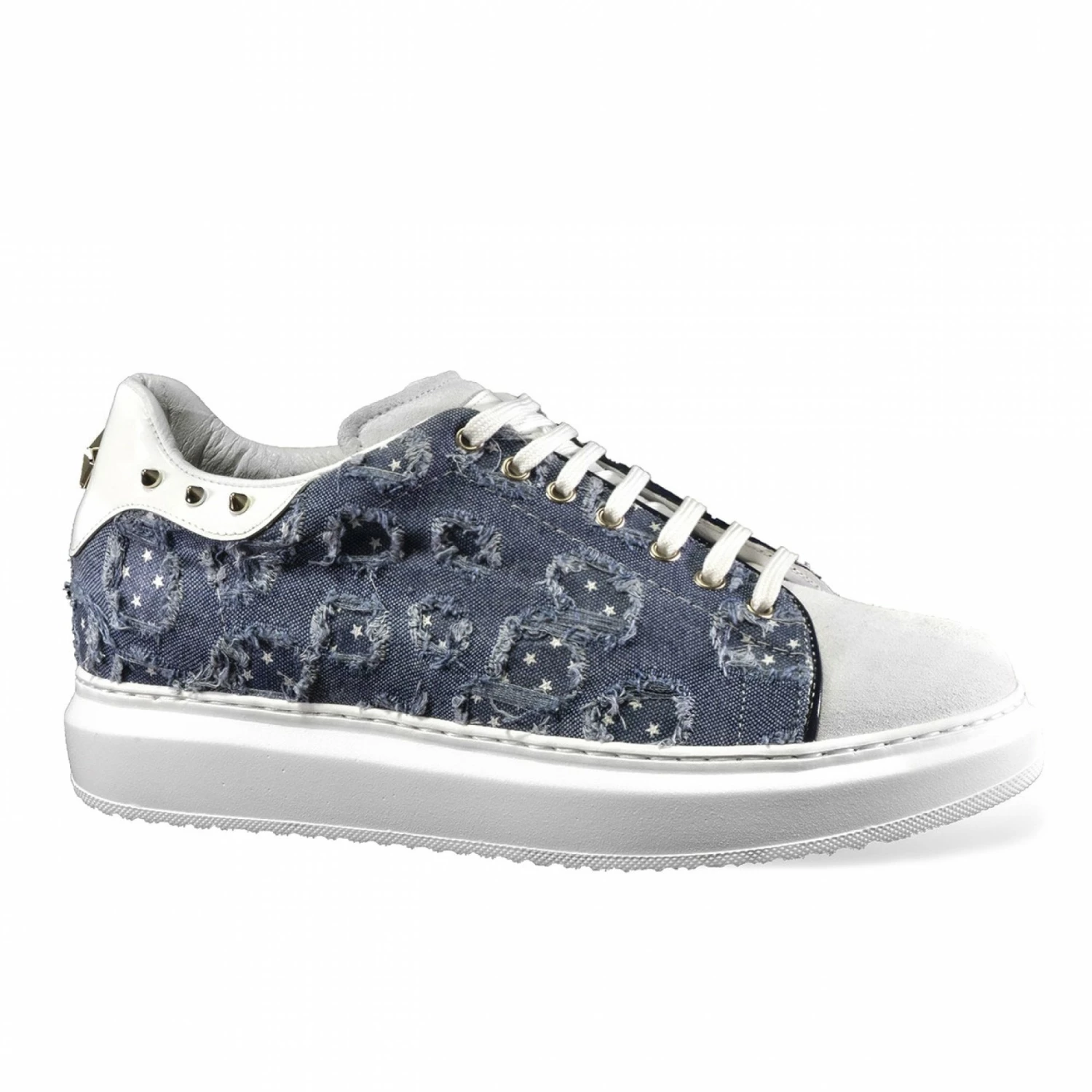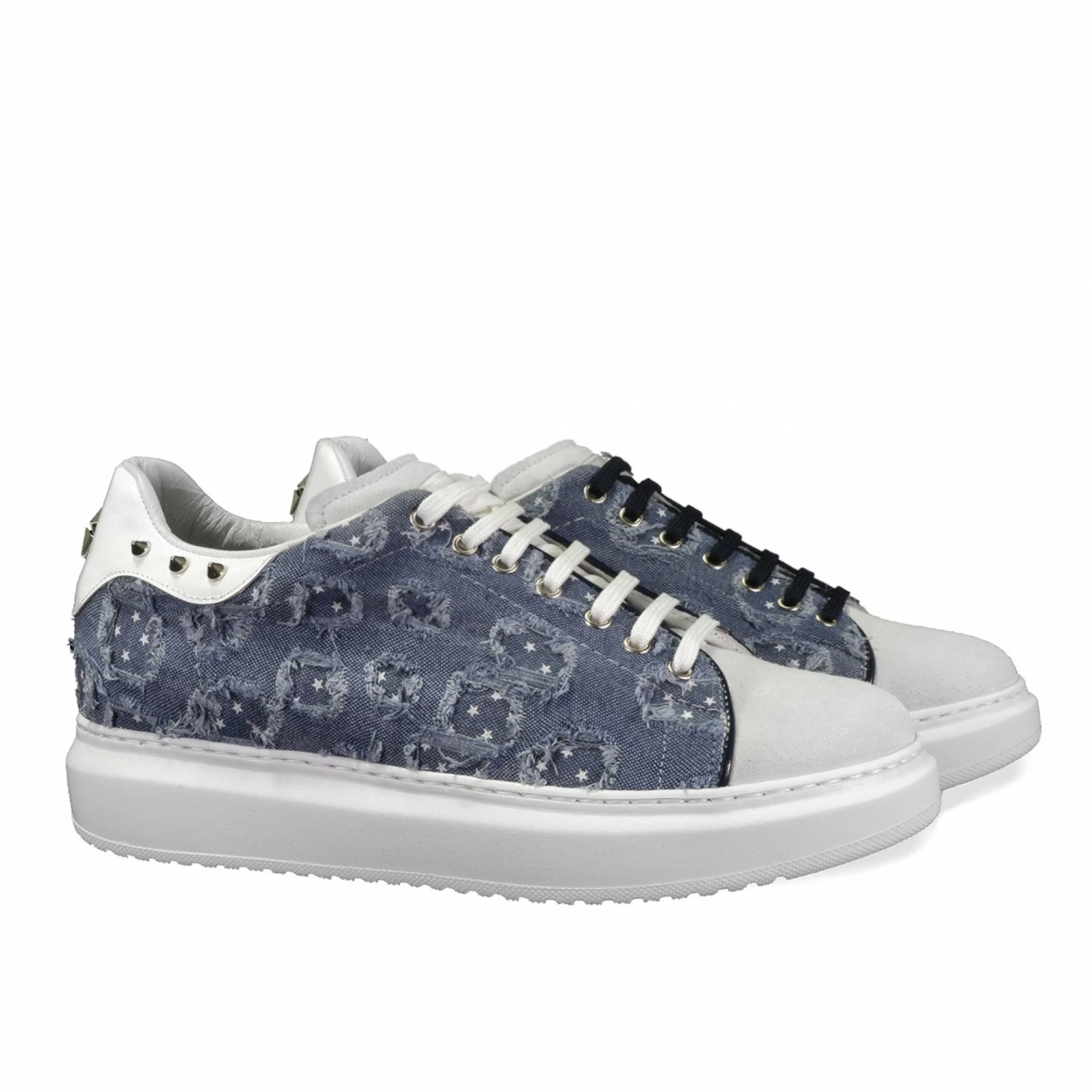 Super trendy sneakers able to add from 2.4 inches (6 cm) up to 3.1 inches (8 cm) to your height, with denim upper, grey suede toe cap and white patent heel tab decorated with studs and silver star.