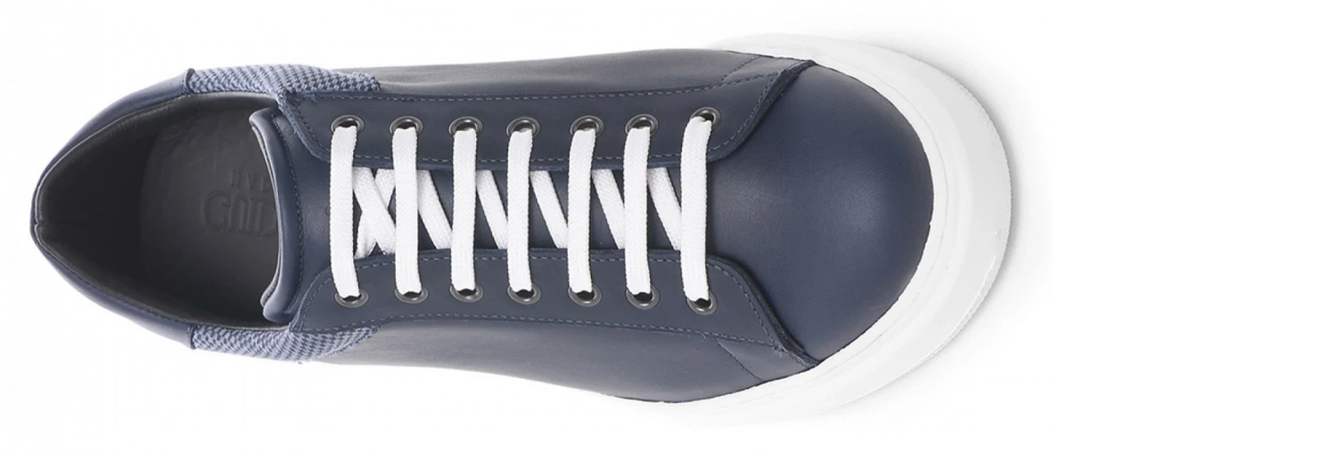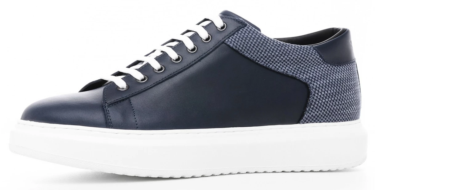 Height increasing sneakers with upper in navy blue full grain leather with denim patterned organic cotton details and comfortable outsole in ultra-light rubber.