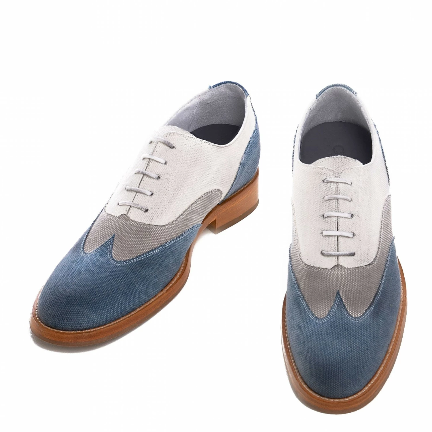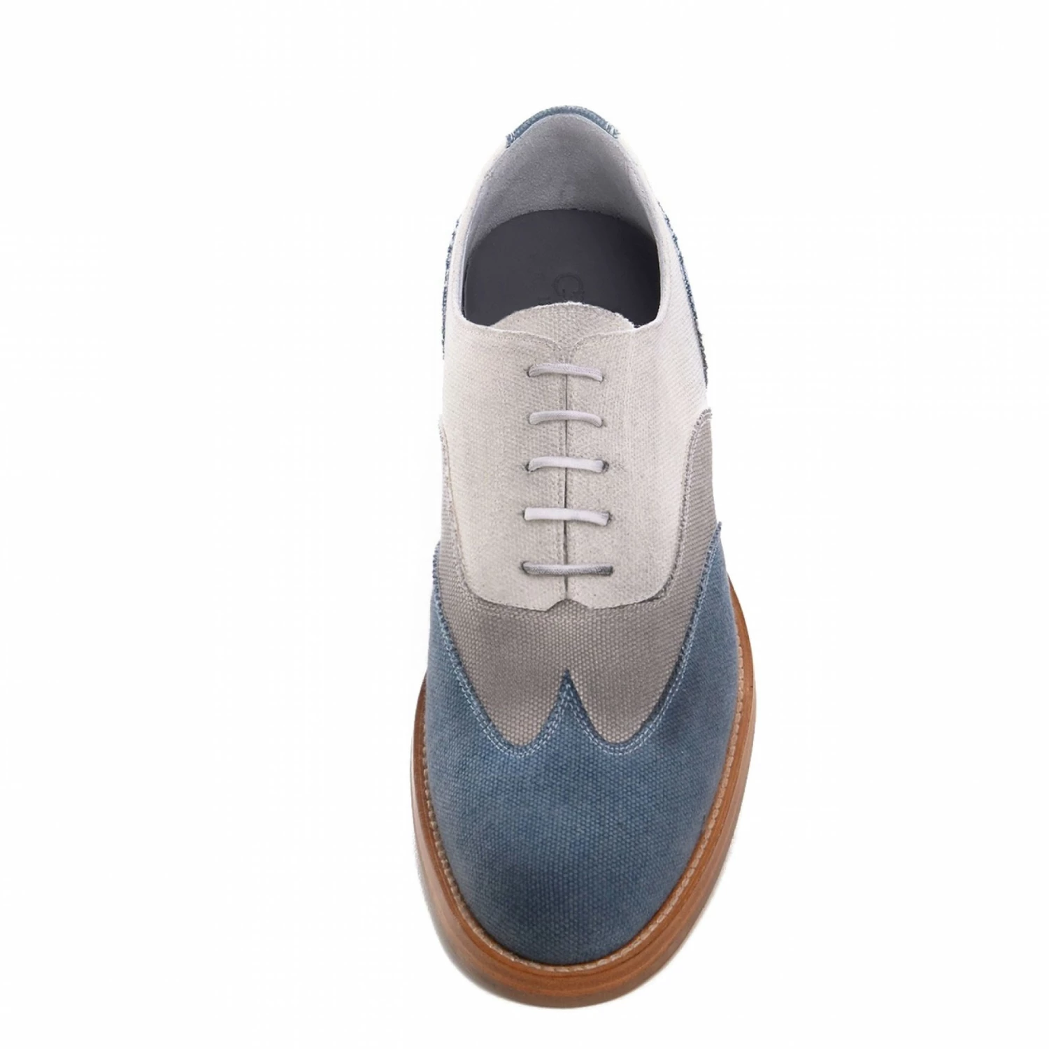 Elevator dress shoe featuring a classic and spring design with upper in 100% natural cotton and stiched leather sole with anti slip rubber. Inner lining made of leather.