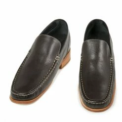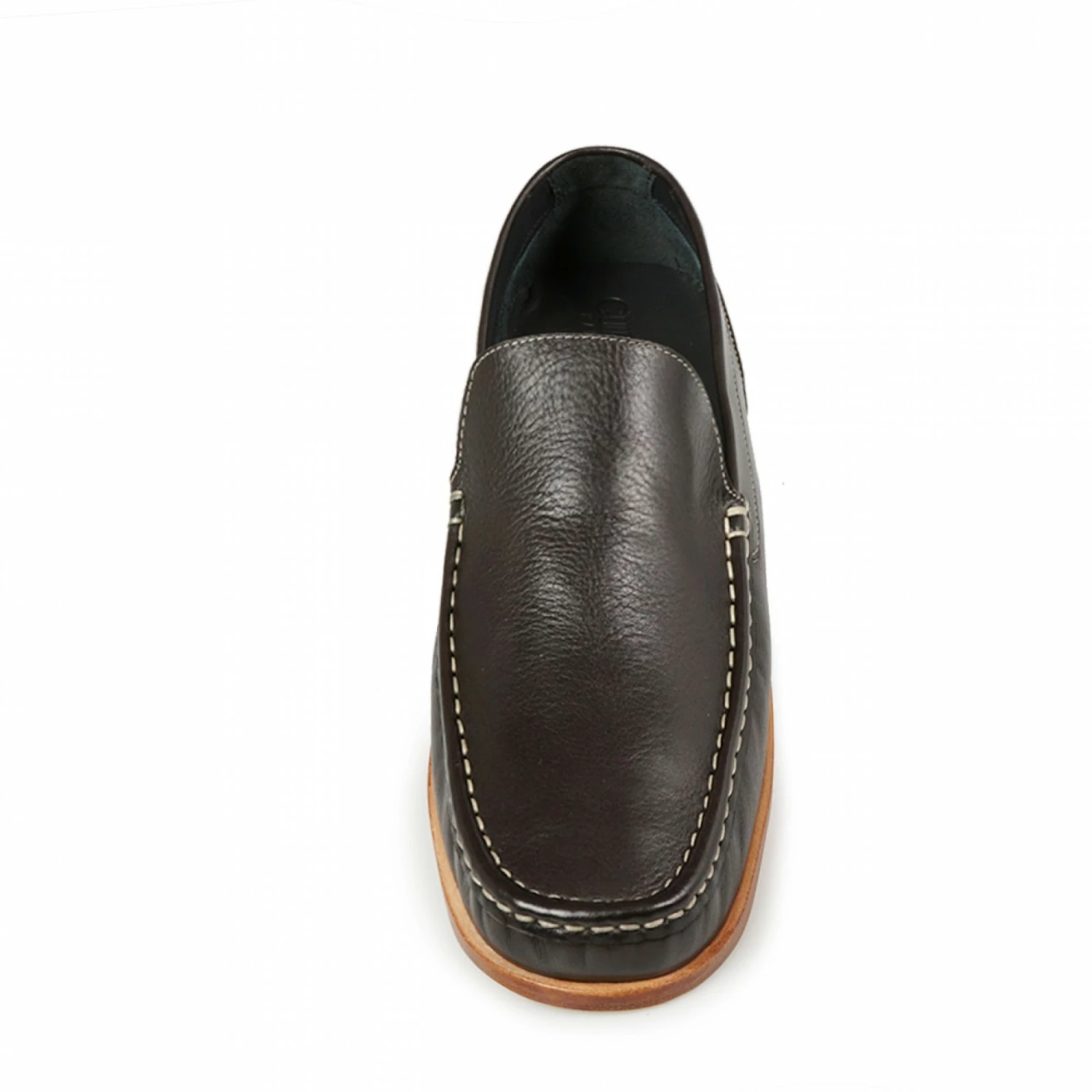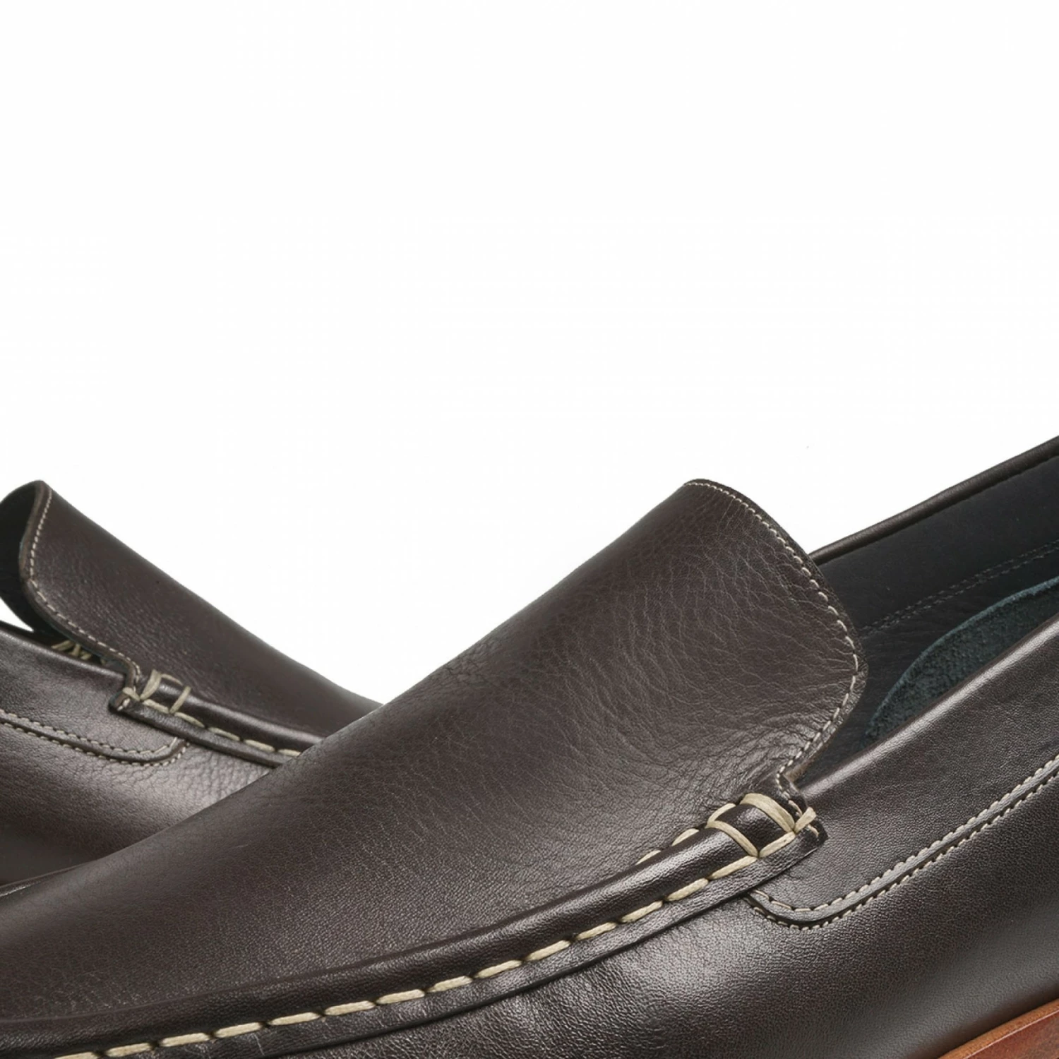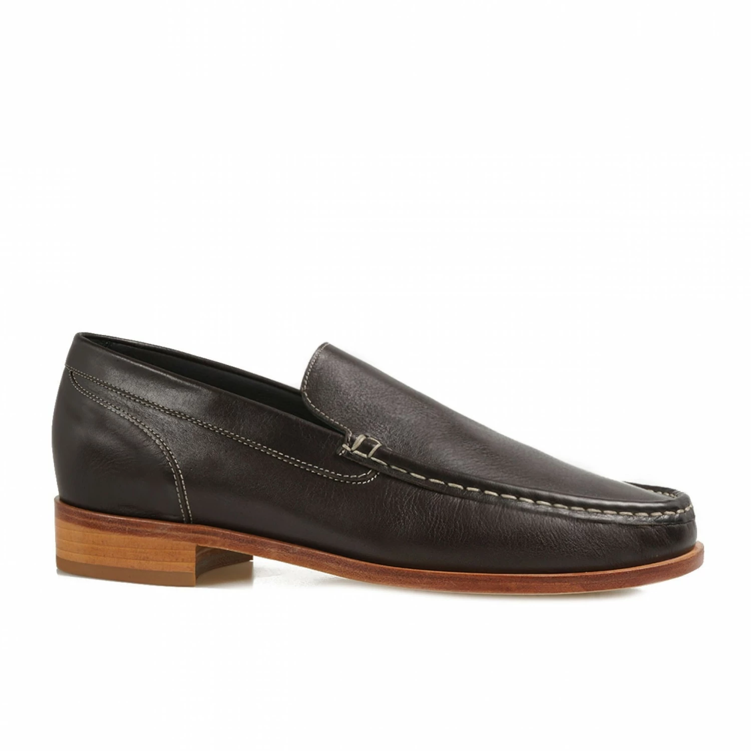 Elegant elevator loafers in dark brown calf leather with handmade stitching on the upper featuring a refined chromatic contrast. The sole in natural leather is stitched at sight.