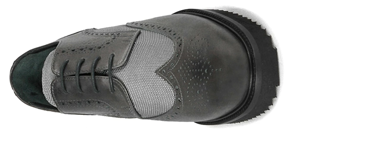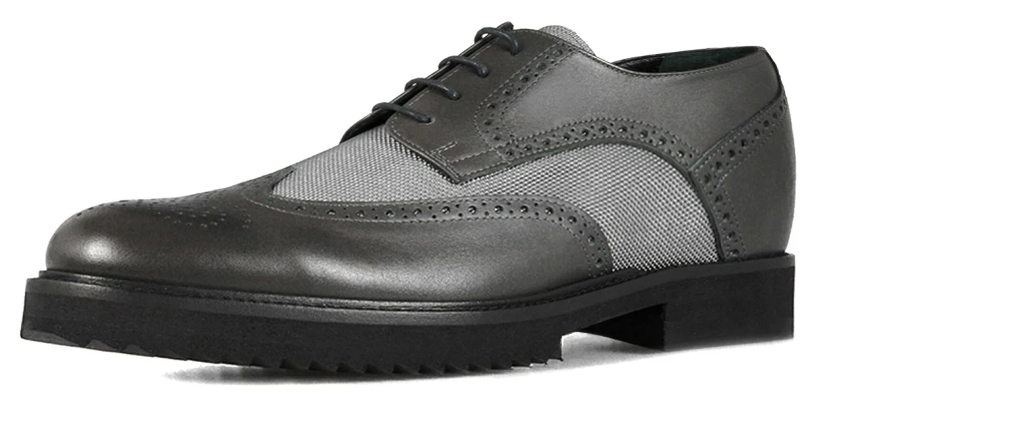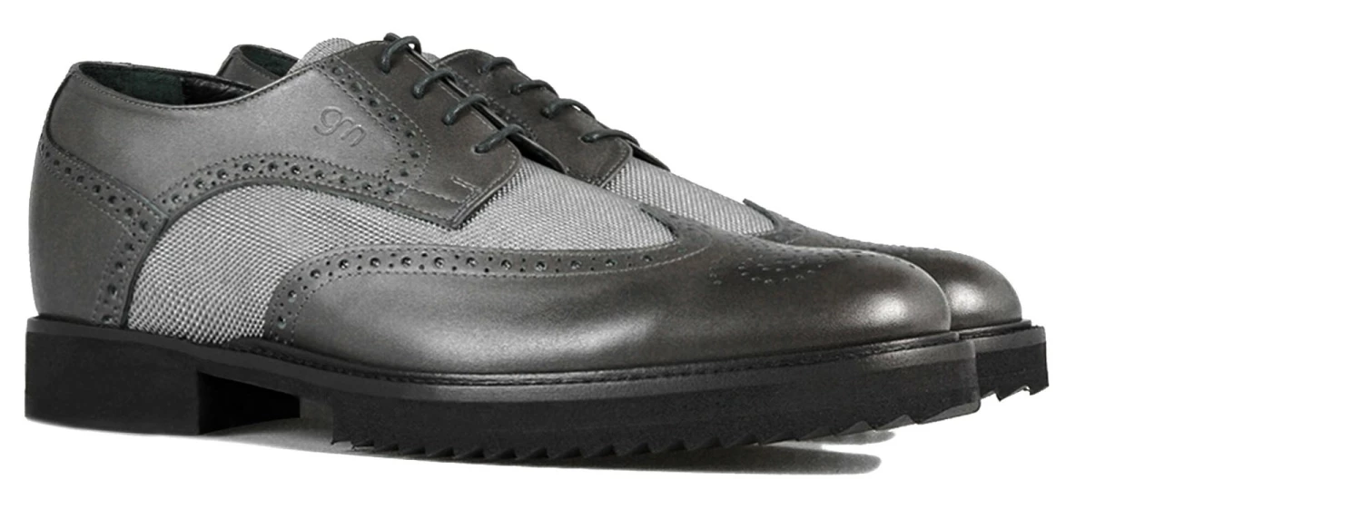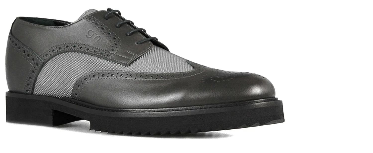 Elevator lace-up shoes made with upper in hand-buffered gray calf leather, light gray fabric details and ultralight rubber sole.