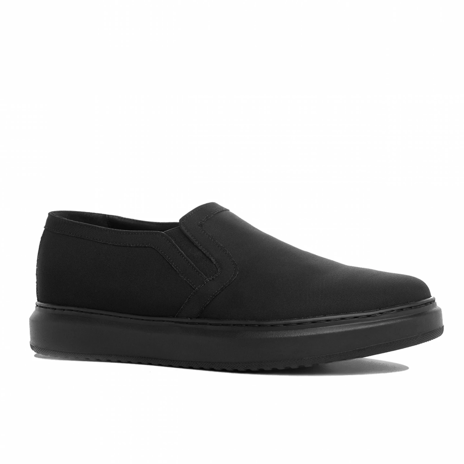 Elevator slip-on with upper in black technical fabric and comfortable tone on tone rubber sole.