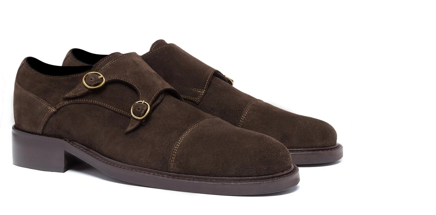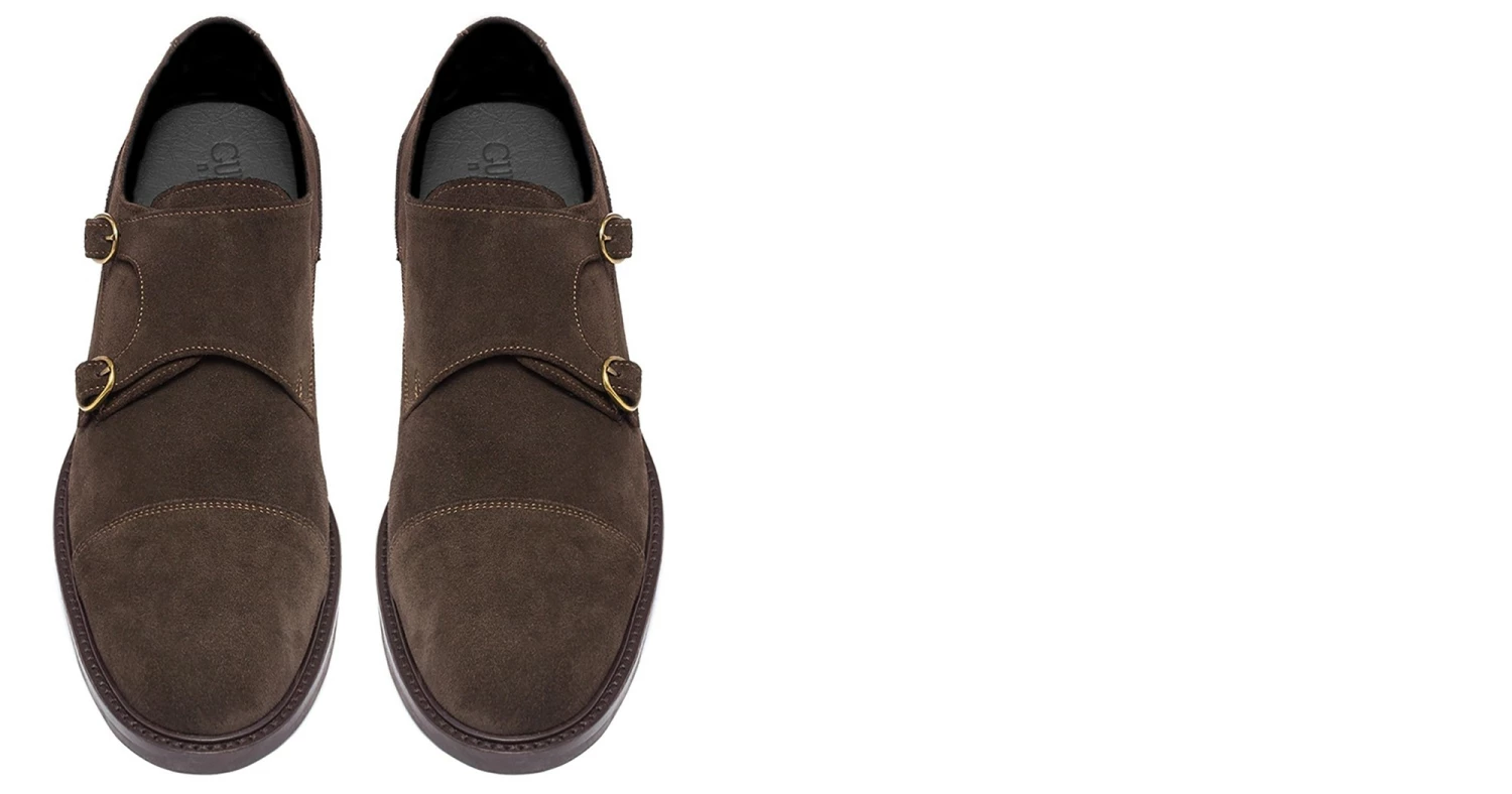 Double buckle elevator shoes with upper in dark brown calfskin suede and stiched leather sole with anti slip rubber. Clean lines and a refined design for a double buckle that radiates the secrets of a meticulous craftsmanship.