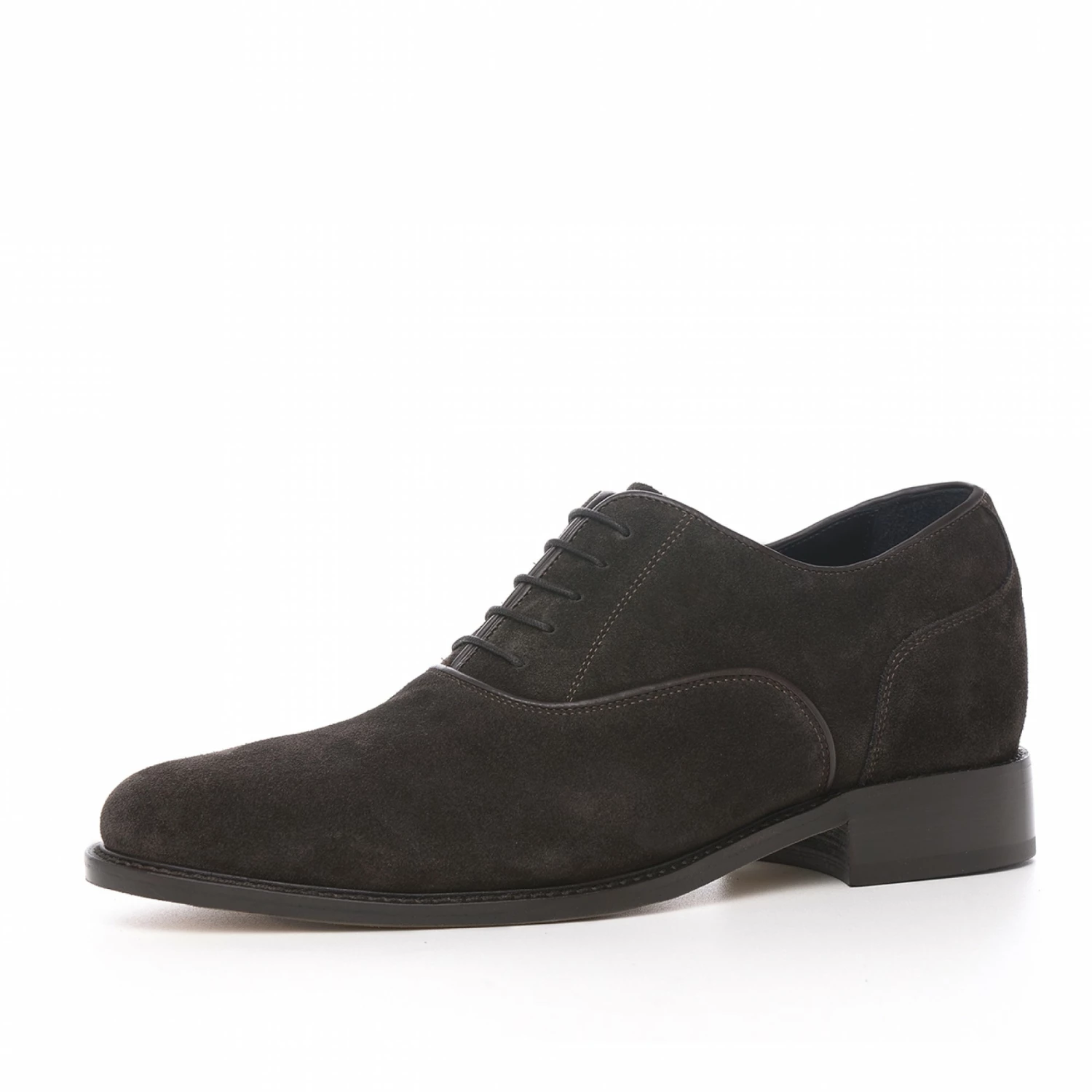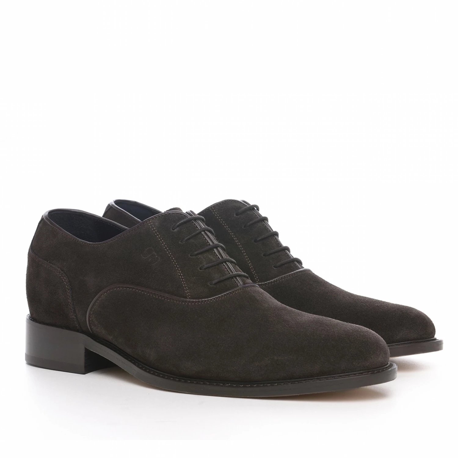 Stylish Oxford shoe handcrafted in Italy with upper in dark brown suede and real leather sole. A refined dress shoe with an invisible inner elevator system able to increase height up 3.1 inches (8 cm), made even more exclusive by the fine Goodyear stitching.