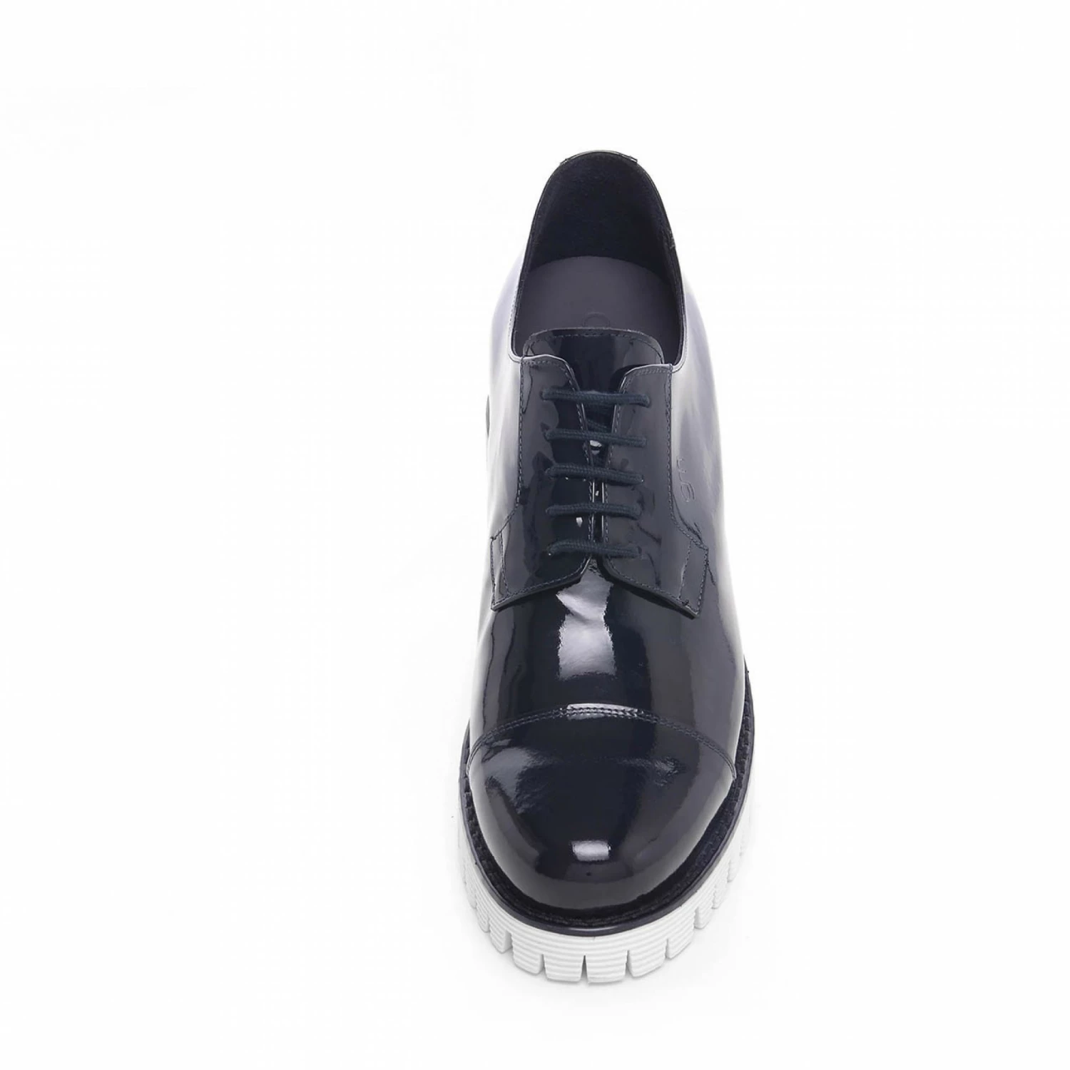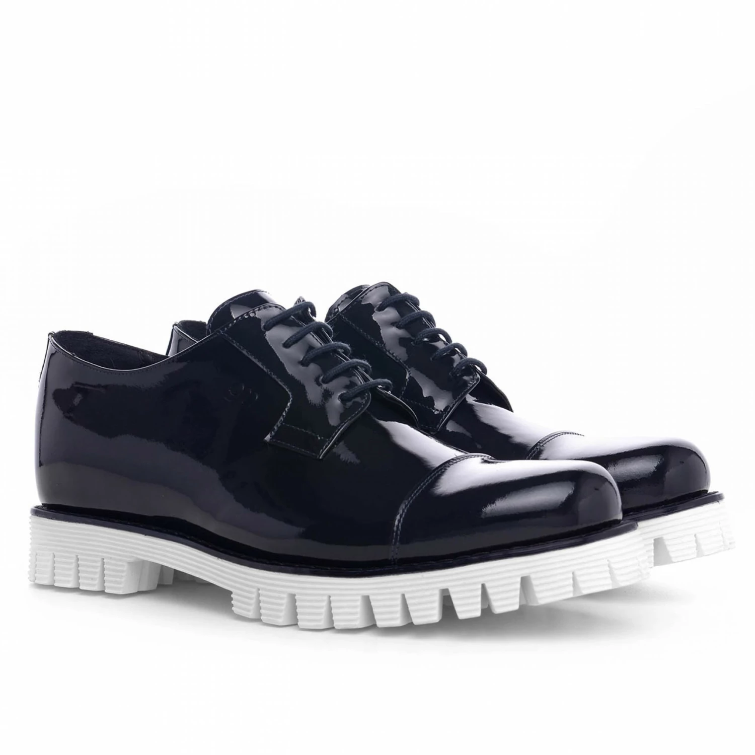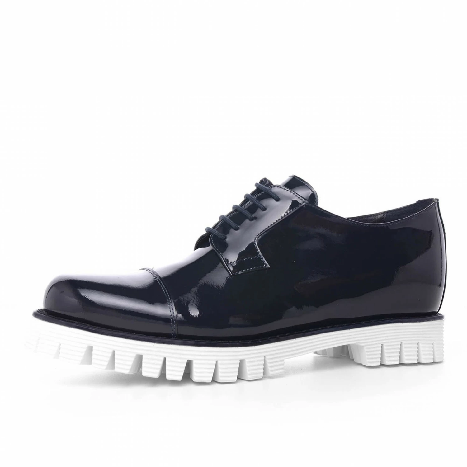 Elevator dress shoe, handcrafted in Italy with upper in dark blue patent leather and white tank thread outsole.