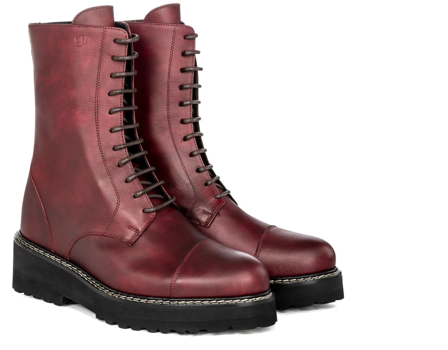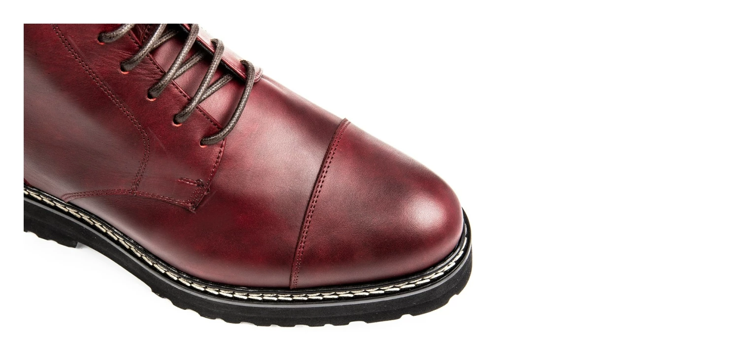 Elevator boots with upper in burgundy calf leather and super durable rubber sole with stitching at sight.