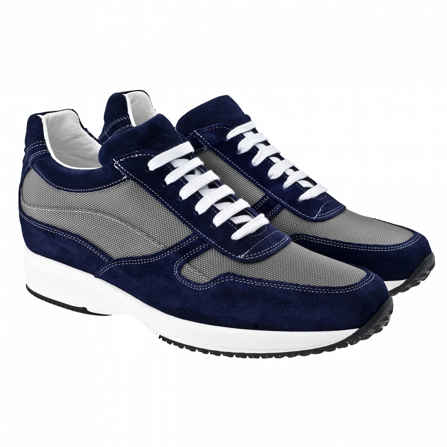 Upper in blue navy suede calf leather and grey technical fabric. Lining in soft goatskin. Insole in genuine leather. Lightweight high quality rubber outsole anti-slip. Height increase: 2.4in(6cm), 2.75in(7cm), 3.1in(8cm) or 4 in(10cm). Hand Made in Italy