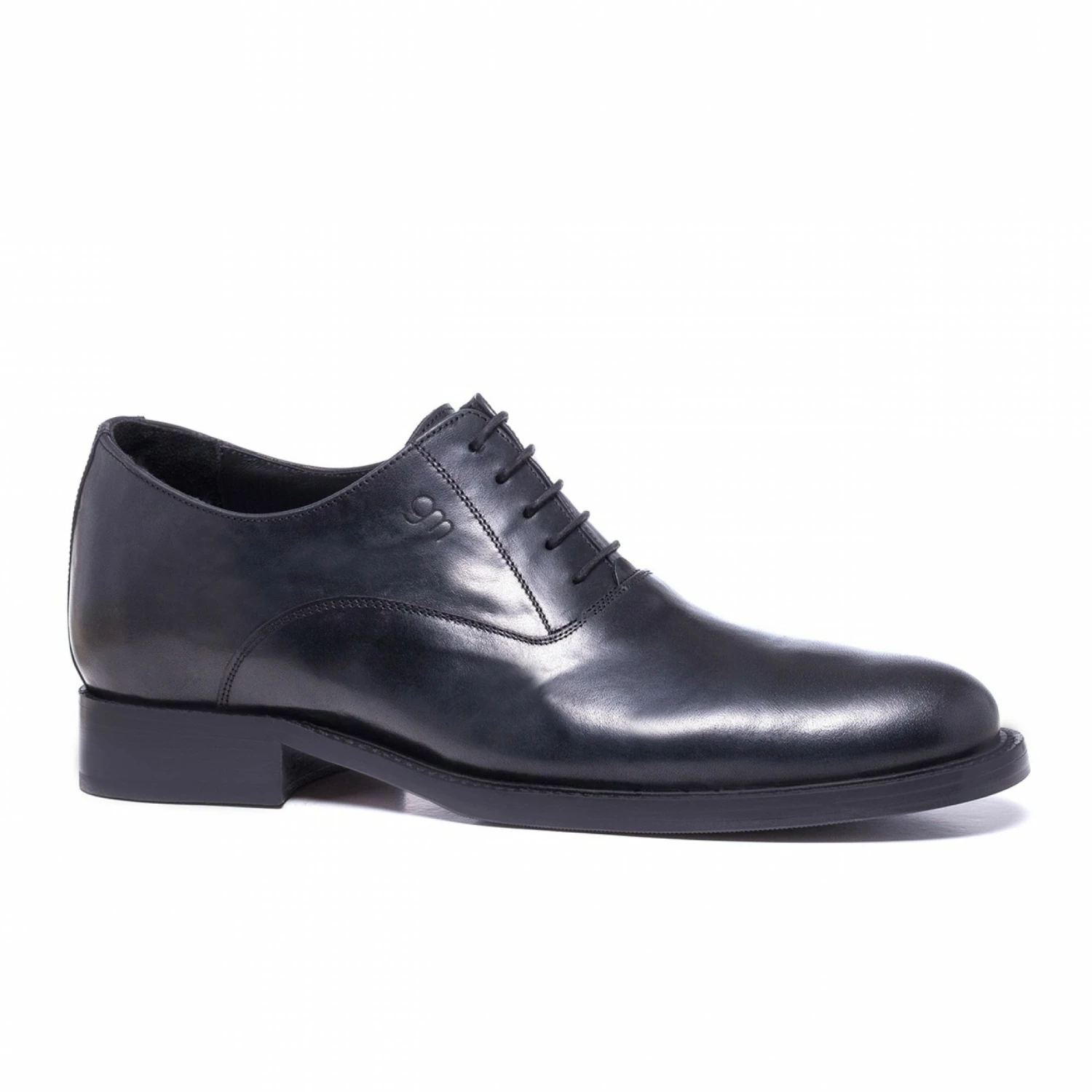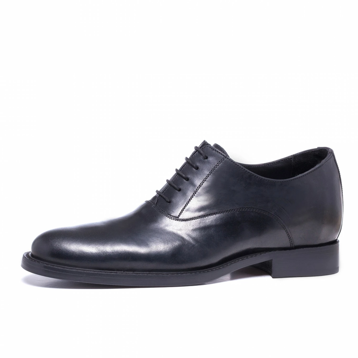 Luxurious elevator shoe with fine upper in black Cordovan leather, naturally shiny, and stiched leather sole with anti slip rubber.