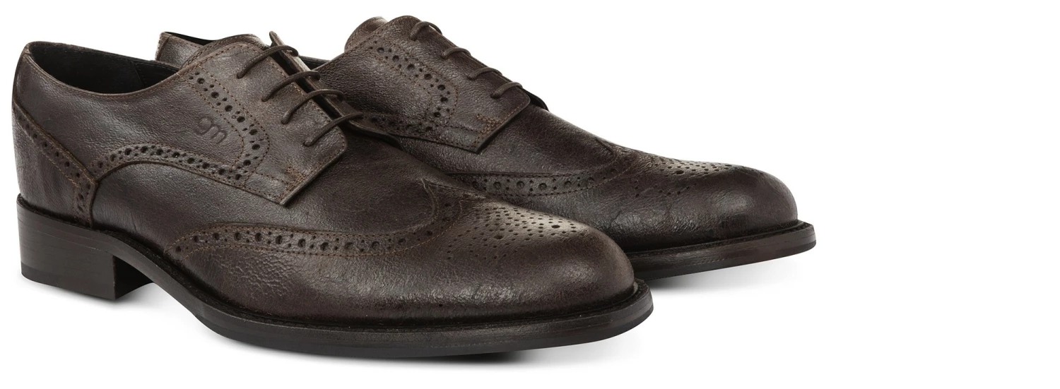 Classic vintage style: the Via Manzoni elevator derby shoe is handmade with upper in brown calf leather featuring a unique aged effect, decorated with full brogue stamped by hand. Tone-on-tone leather sole stitched at sight and anti slip rubber.