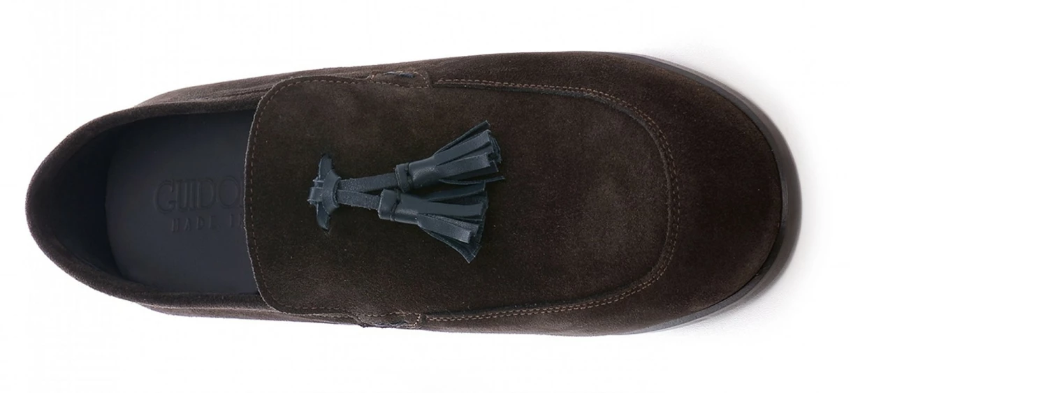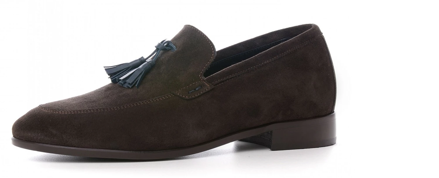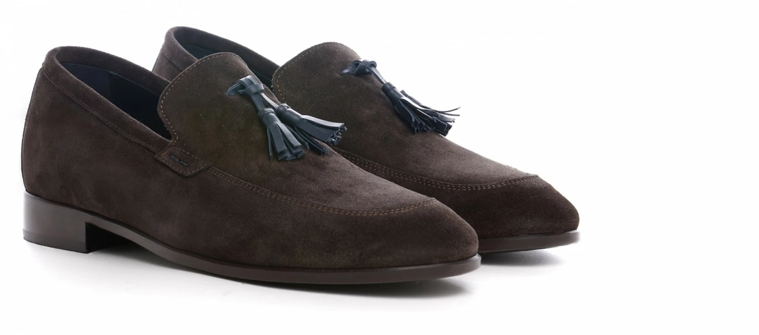 Handmade elevator loafer with upper in brown suede and elegant tassels in blue full grain leather. The real leather sole is crafted and sewn at sight.