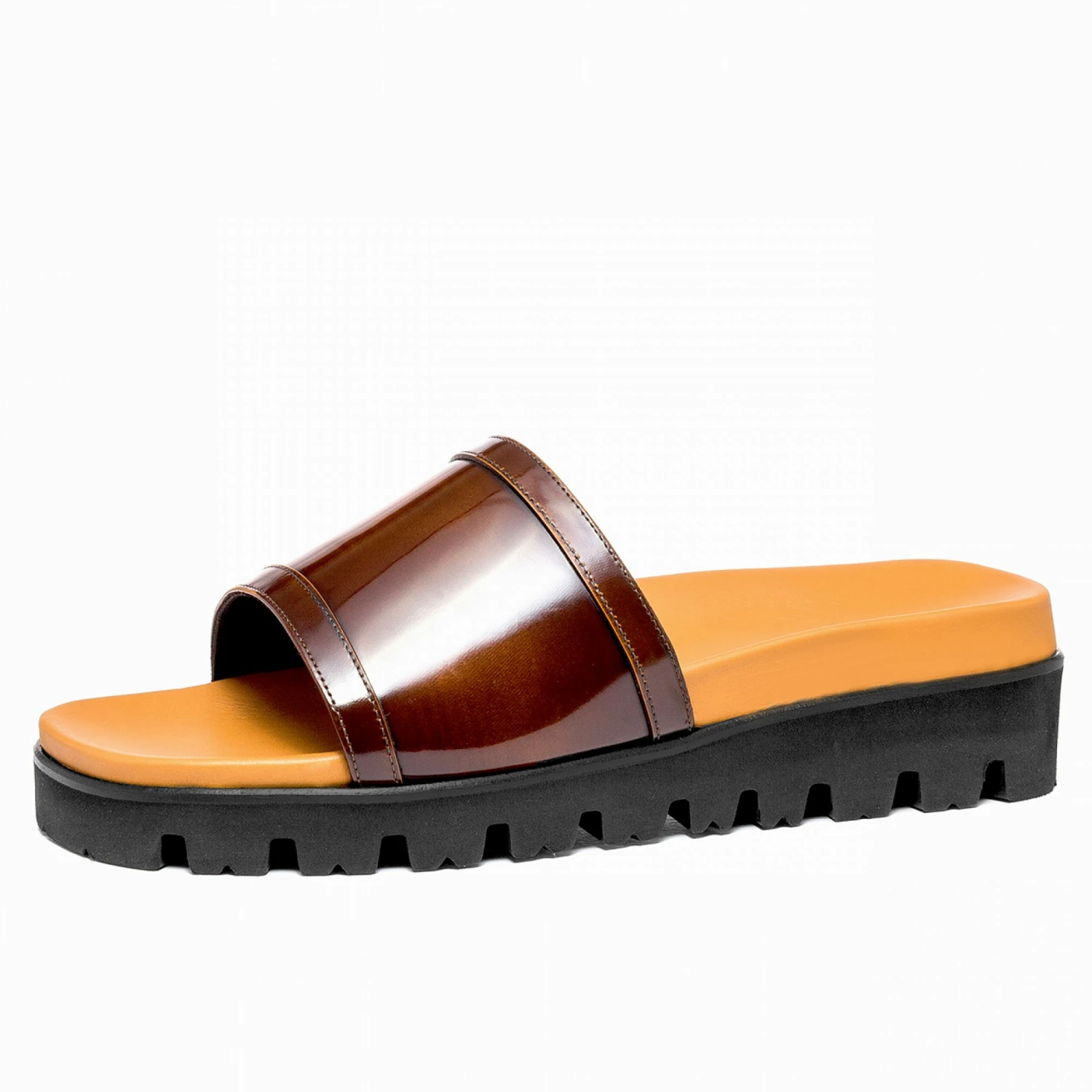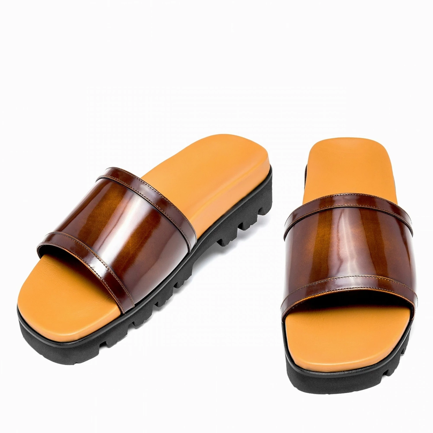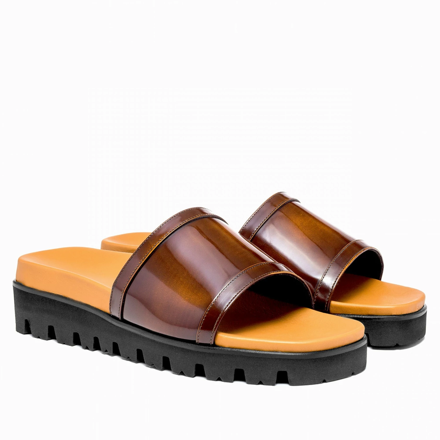 Created to meet the demand of those who want to be taller even on the beach or by the pool, the Vieste are luxurious sandals in full-grain shiny calfskin brown leather with ergonomic and comfortable brown leather-covered insole.
