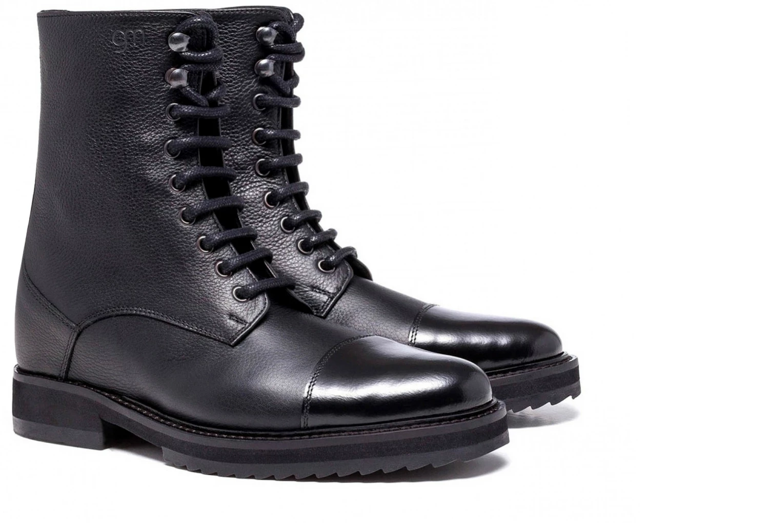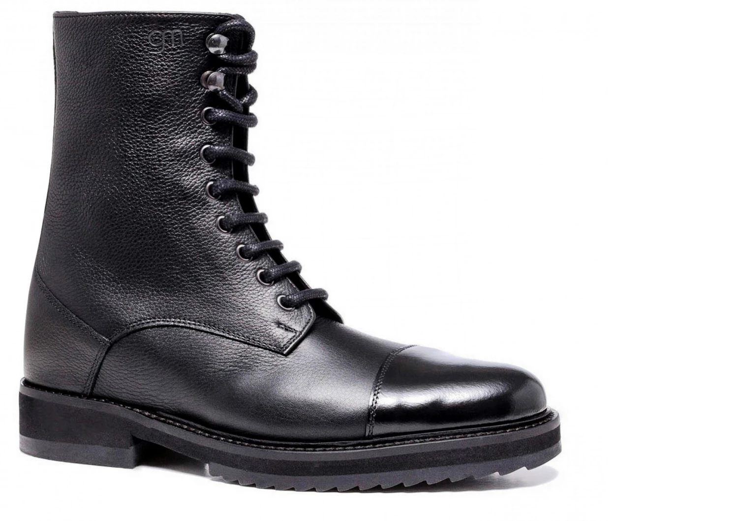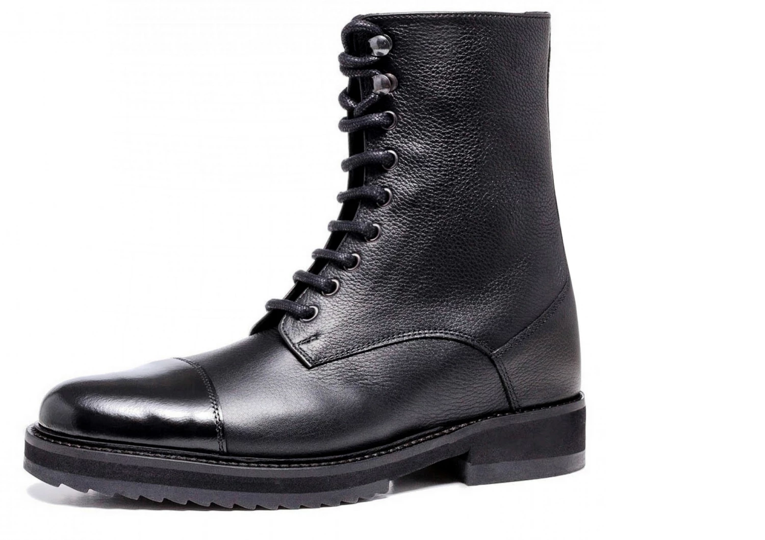 Boots with invisible inner elevator system up to 4 inches (10 cm), featuring upper made of black full grain leather and shiny black calf leather on the toe-cap. The tone-on-tone sole is made of durable super-light rubber.