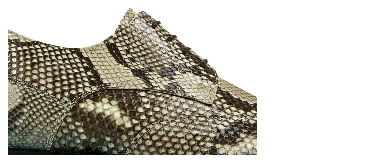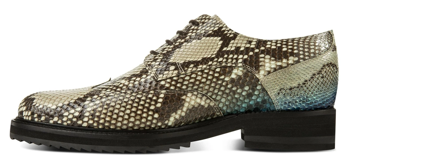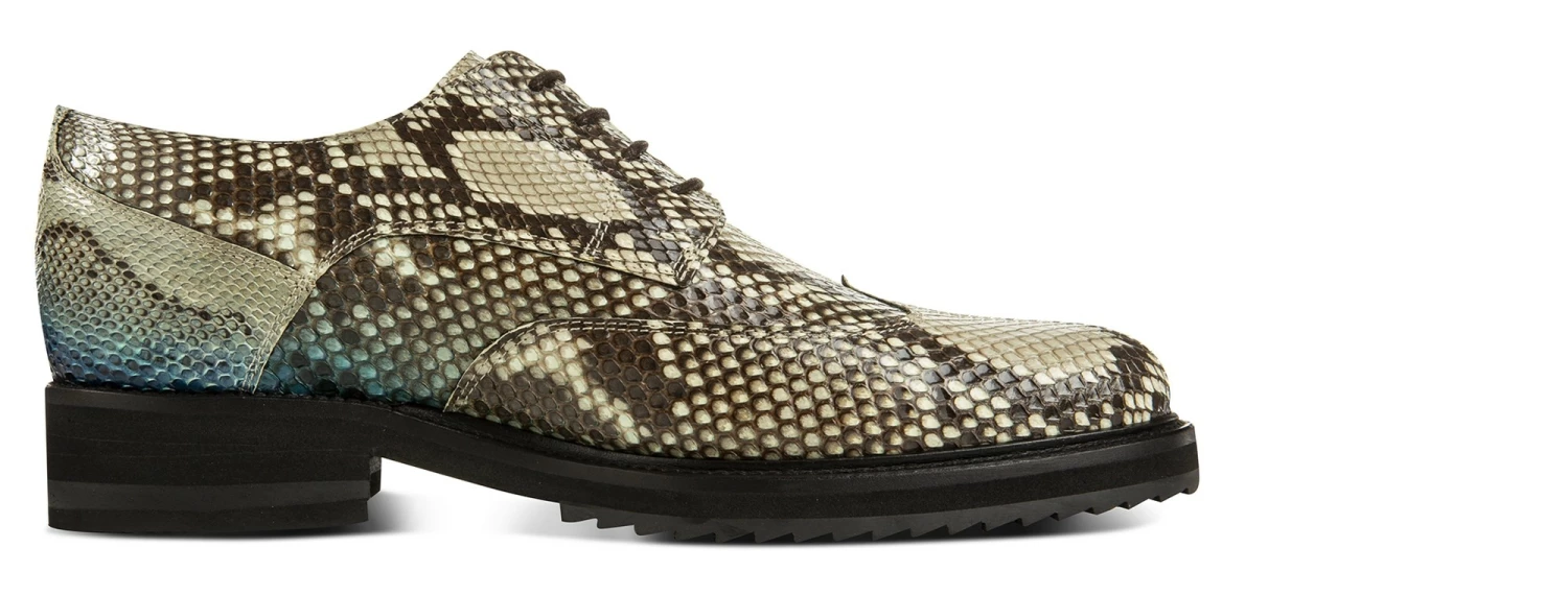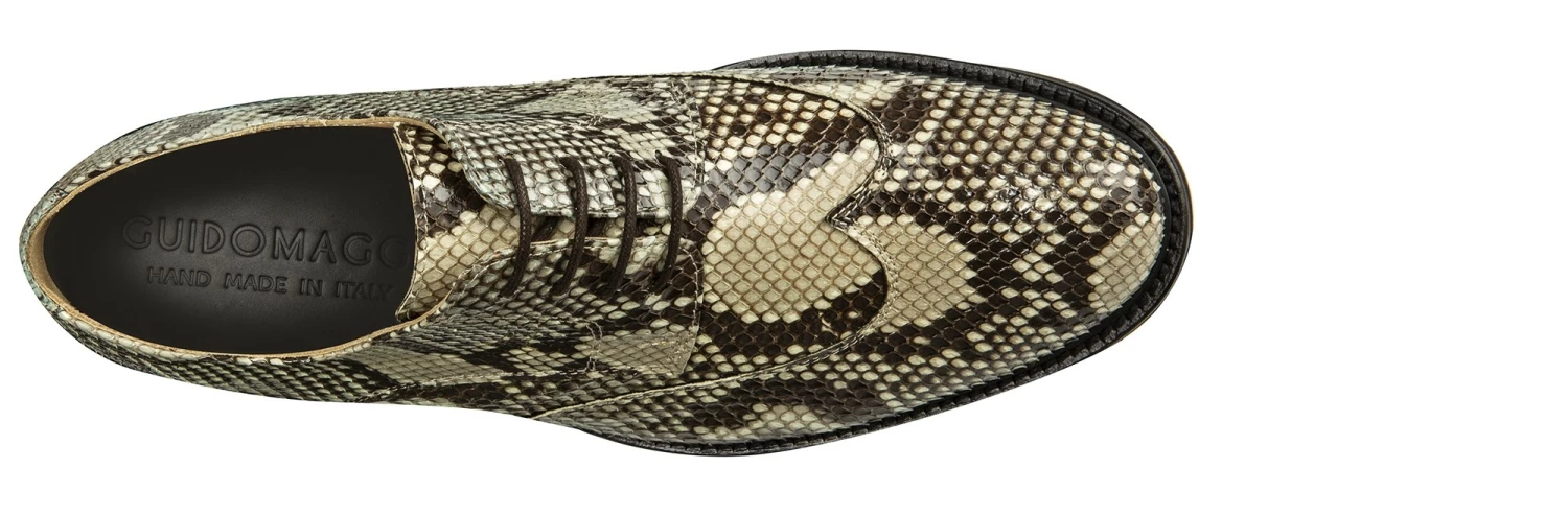 The quintessence of true luxury: the new GuidoMaggi collection’s elevator shoe is a masterpiece of style. The upper is handmade and tailored in 100% genuine python, embellished with shades of blue, beige and rock tones.