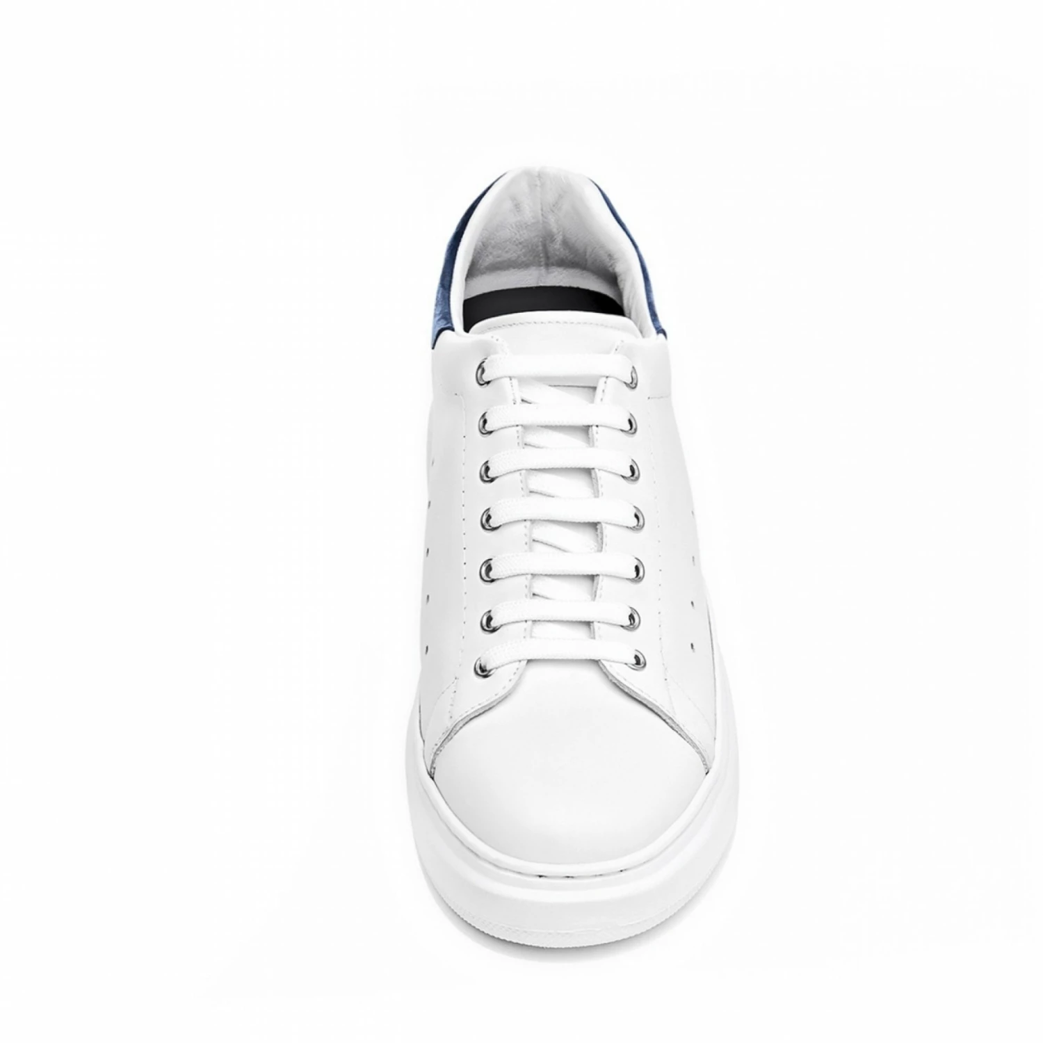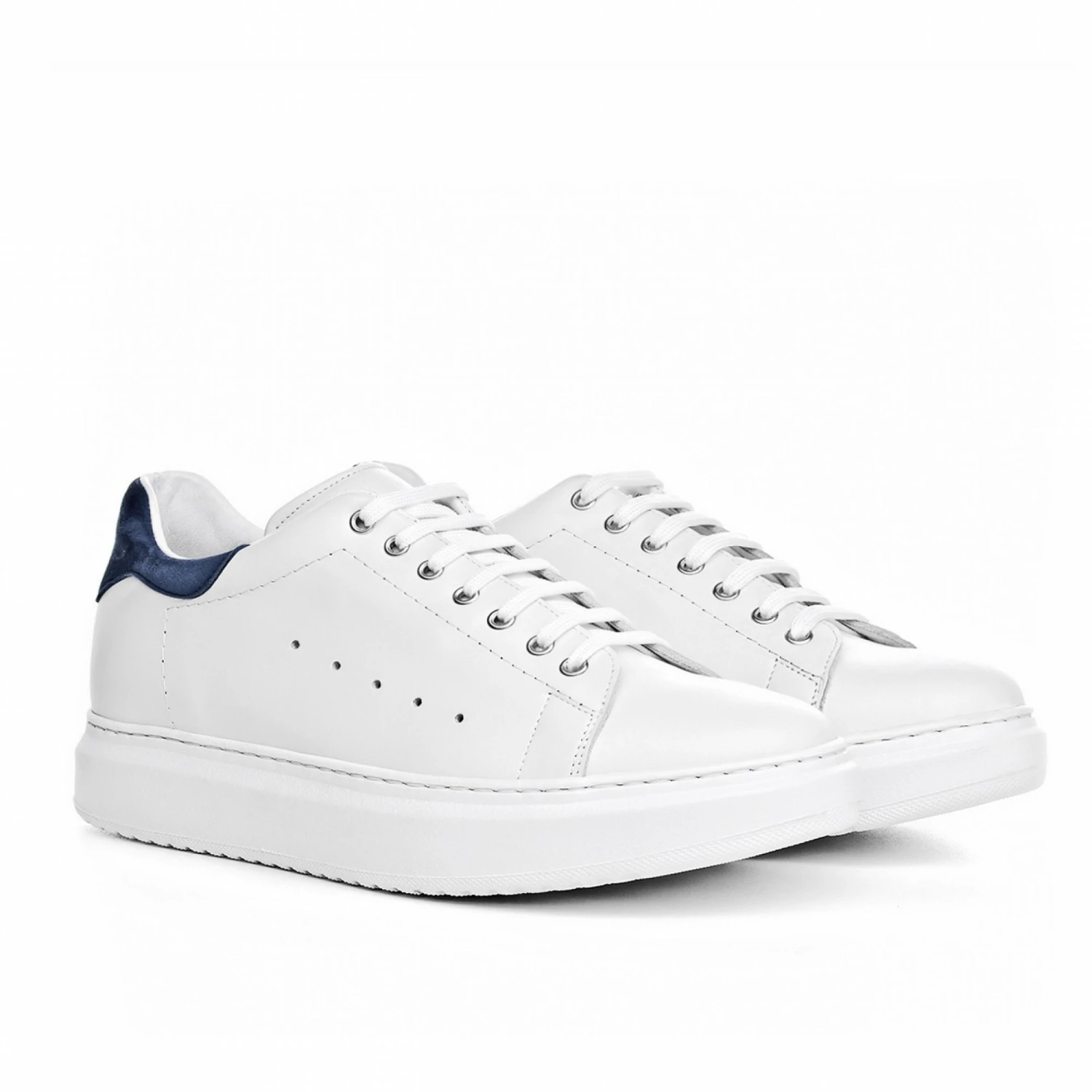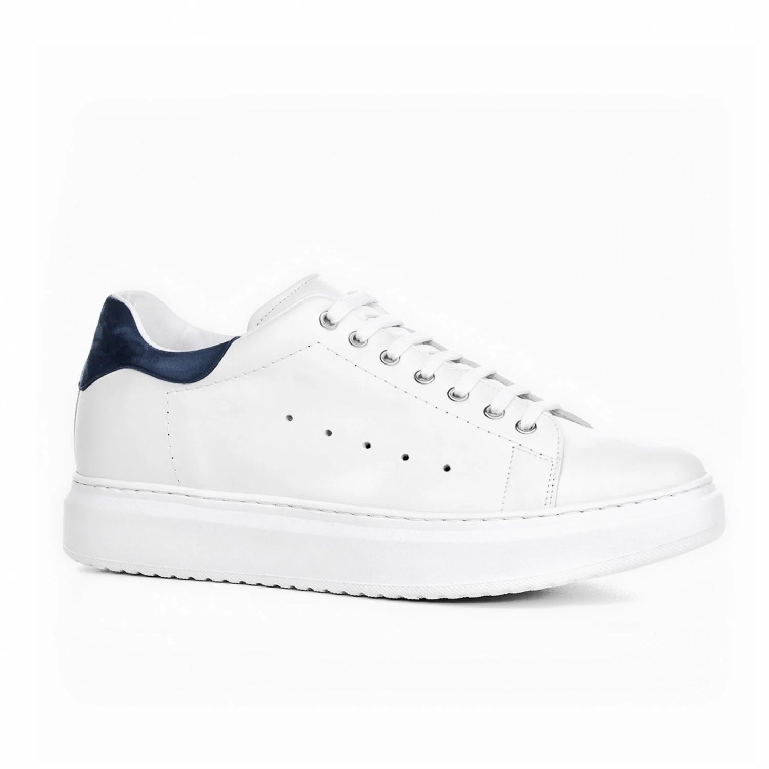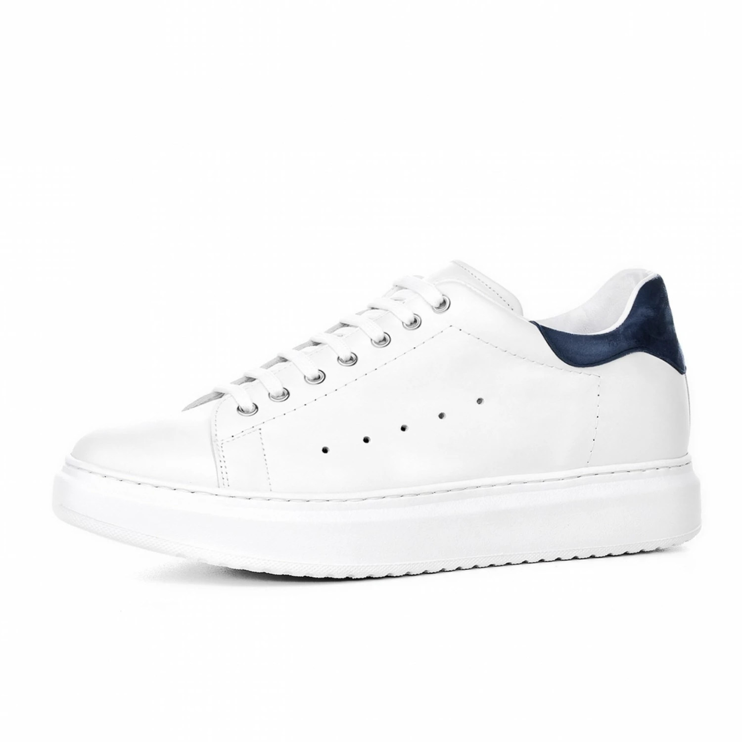 Low-top elevator sneaker featuring upper in white full-grain leather enriched with cobalt blue suede details on the heel tab. The white sole is made of natural rubber.