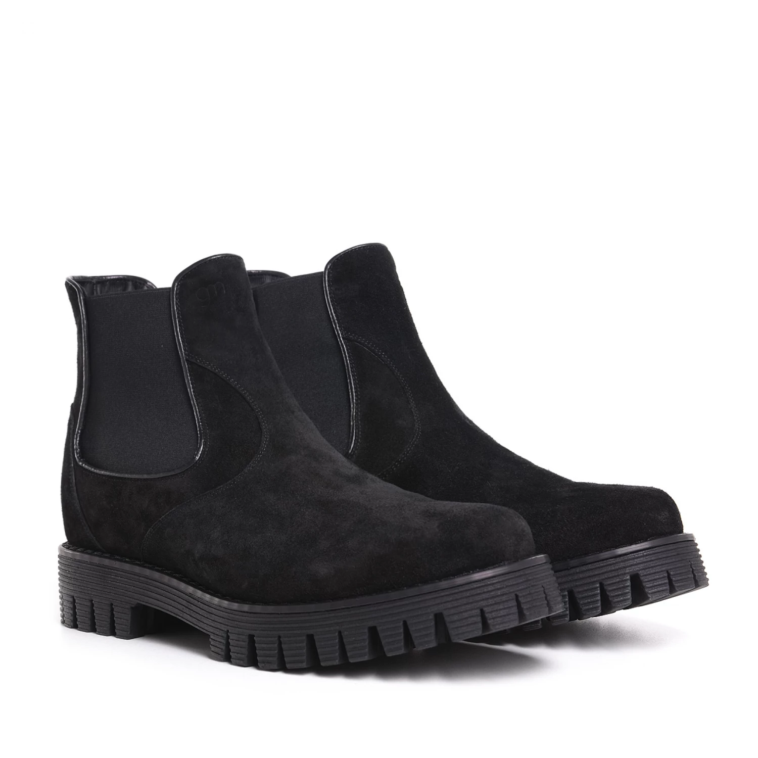 Elevator ankle boot handmade in Italy with upper in soft black suede and super light tone on tone rubber sole.
